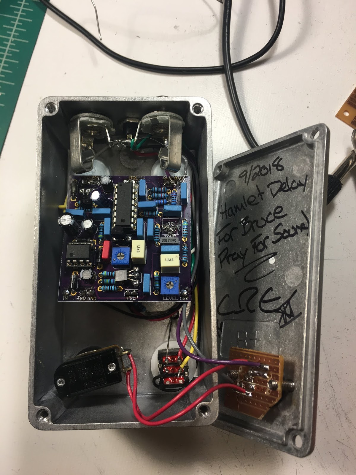 Here are a couple builds I just finished for my friend Bruce in Pray For Sound. The Admirer is a Hamlet Delay with a momentary feedback switch. The trimpot in the base plate controls when the oscillation starts  after pressing the switch. Hats of to Jon (midwayfair) for making a truly beautiful sounds delay. I absolutley love this circuit.